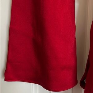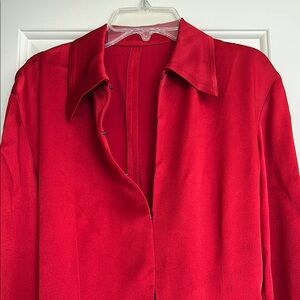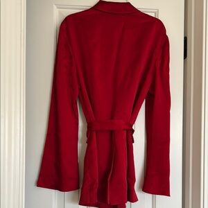 Stylish red blazer with a tie waist. Perfect for any occasion. Satin makes it to look great for a special occasion . It has a split on the back , bell sleeves and small hooks in front instead of the buttons . Size XS .