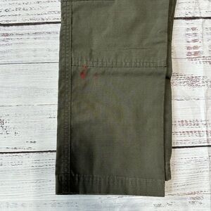 A bit of wear and tear on the leg of the tan pants, and a paint stain on the leg of the olive pants. Please refer to last 2 photos for condition of the pants.