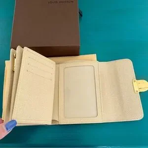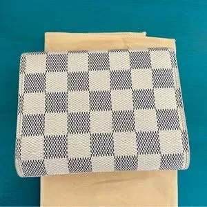 This is an authentic Louis Vuitton wallet in the Damier Azur color in the style called the PF Joey. The style number for this wallet is N60030 . This Louis Vuitton wallet is very unique from other Louis Vuitton styles in the way that it has a clear plastic window for an ID on the inside and also in the way that it is very spacious for being a compact wallet. It has a zippered coin purse on the front, 9 card slots, and room for cash in the back. There is also a pocket on the front of the zippered coin slot as well. Wallet has a push lock closure. This is such an underrated Louis Vuitton wallet that is now discontinued! It is great because it holds a lot and will fit in smaller size bags. It is in excellent condition. Listing photos accurately depict its condition.