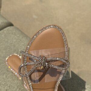 These rhinestone flat sandals are just what you need to make any outfit instantly glamorous!! Soft, faux leather covers the sole of these chic slide sandals with an ultra-chic and minimal, clear vinyl toe band, finished with shiny rhinestone trimmed and a embellished bow.