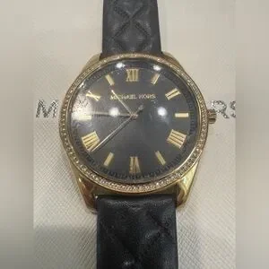 Elegant Michael Kors watch with a black leather strap and gold accents. Rhinestones around watch face .