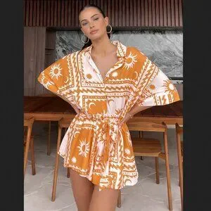 Commense Medium Orange White Boho Sun Moon Short Jumpsuit Summer Vacation NEW