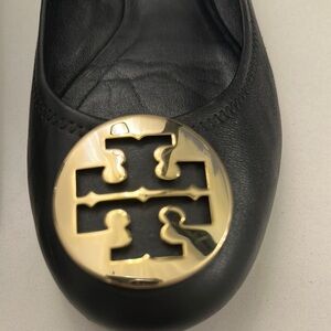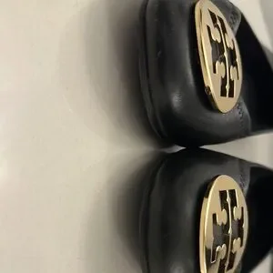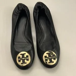 These Tory Burch flats showcase a sophisticated blend of black leather and a gold-tone logo medallion, offering a chic and versatile style. The slip-on design with a rounded toe and slight elastic edge ensures comfort and a perfect fit. Ideal for both casual and formal occasions, these flats are a timeless addition to any wardrobe.