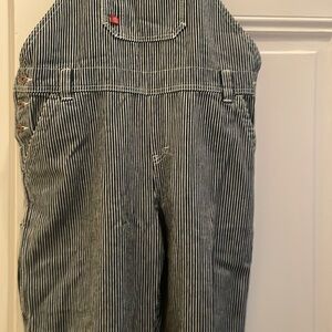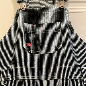 Stylish Dickies striped denim overalls. Features adjustable straps and front pocket. Perfect for casual wear.