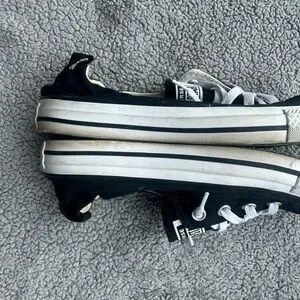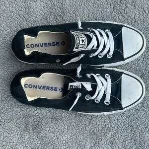 These Converse sneakers feature a classic black canvas upper with a white rubber toe cap and midsole, offering a timeless look. The slip-on design with an elastic tongue ensures easy wear, while the iconic Converse branding adds a touch of authenticity. Perfect for casual outings, these sneakers combine style and convenience effortlessly.