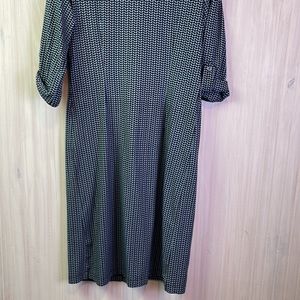 Chic midi dress by J. McLaughlin. Features a classic black and white pattern. Button-down front with rolled sleeves. Perfect for versatile styling.