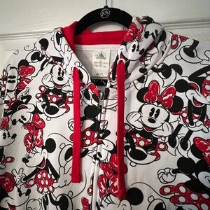 Charming hoodie with Minnie Mouse print fabric and a Minnie bow on the hoodie.Features red and black accents. Ideal for Minnie enthusiasts. EUC