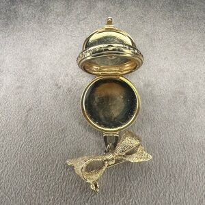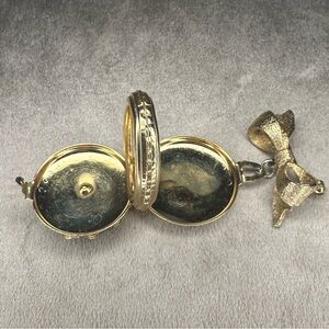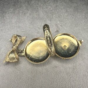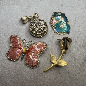 Elegant vintage brooches featuring a coral butterfly, a gold rose, a butterfly floral cloisonne, and a gold bow locket with a double compartment separated with a clear divider