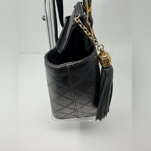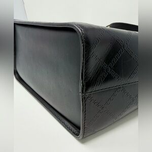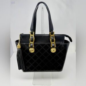 Iconic Hardware: Gold-tone Medusa medallions with “Gianni Versace” engraving, Greek Key handle clasps, and a matching black leather tassel charm with a gold Greek Key pendant—pure vintage vibes!