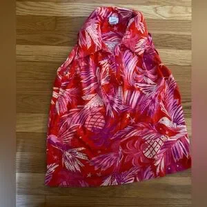 This vibrant Sigrid Olsen tunic showcases a bold tropical print in striking red and pink hues. Crafted from a lightweight, flowing fabric, it features a high neckline and a sleeveless design, perfect for warm weather. The large-scale botanical pattern adds a dynamic touch to this eye-catching piece.