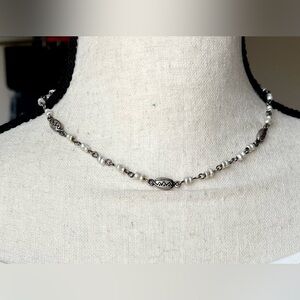 16” faux pearl (could be real) and beads with a zigzag pattern. Toggle clasp, no markings , brand unknown. Dainty piece - could be vintage.