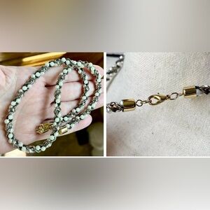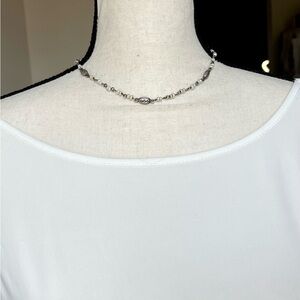 17 1/2” faux pearl swirl with silver tone that looks like metal ribbon, lobster claw clasp gold tone, brand unknown.