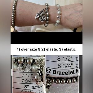 Elastic bracelet with fax pearl beads- round , spacers, and I e faceted with black dots similar to a dice. 2 charms : flower and leaf. Fits comfortable up to 7 without stretching beads, No markings, brand unknown.