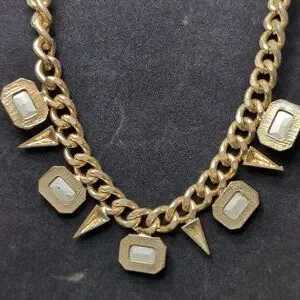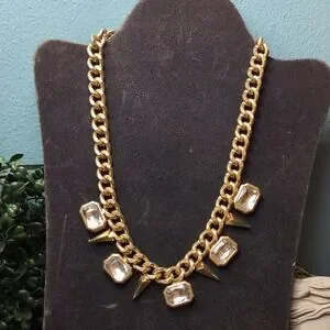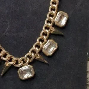 This exquisite necklace showcases a harmonious blend of gold and silver tones, featuring a classic curb link chain adorned with clear crystal pendants and spikes. The faceted charms catch the light beautifully, adding a touch of elegance to the bold chain design. Perfect for making a statement with its refined yet substantial look.