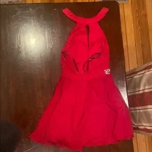 This stunning red sundress by Speechless features a sleeveless halter neckline, perfect for prom or cocktail events. The dress boasts a flowy tulle skirt that adds volume and a touch of romance. Its backless design enhances its elegance, making it a standout choice for special occasions.