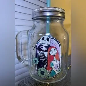 Mason jar drinking cup featuring Jack Skellington and Sally from The Nightmare Before Christmas.
