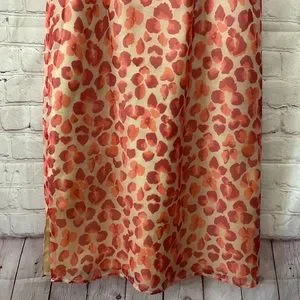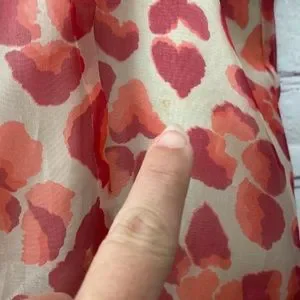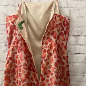 I’m torn if it is an animal print or rose petals. Very dainty and delicate strap silk dress, Midi length with rear zipper. Great condition but two little pin point size spots in photos, cannot see unless looking for them.