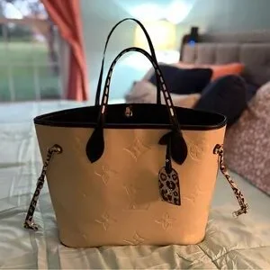 Louis Vuitton Cream Tote Bag with a pink and black leopard design!