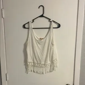 This Takara crop top features a sleeveless design in a soft white hue, perfect for warm weather. The relaxed fit and playful fringe embellishments along the hem add a bohemian touch to this stylish tank top. Crafted from lightweight fabric, it offers comfort and effortless style for any casual occasion.