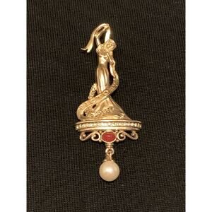 The Lady Victory Race for The Cure Brooch by Ann Hand Limited Edition #712 is a unique and elegant accessory perfect for various occasions. This asymmetrical brooch features a gold color with a dangle white pearl main stone, carnelian secondary stone and cz's creating a beautiful and feminine look. Signed by the brand Race for the Cure by Ann Hand, this vintage piece is 3.5 inches in length, making it a statement piece for women celebrating special events like engagements, weddings, and anniversaries. The brooch is a limited edition item, adding a touch of exclusivity to any outfit.