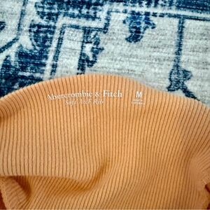 Abercrombie & Fitch ribbed bodysuit with square neckline, spaghetti straps, and low/open back with a large twist detail. Part of Abercrombie’s Soft A&F Rib line. Bodysuit is a beautiful soft orange or peach shade. The perfect summer piece for a bright, sunshiney moment.