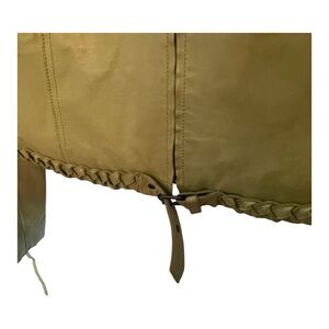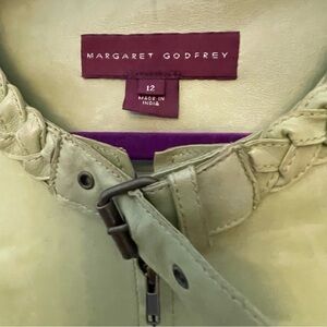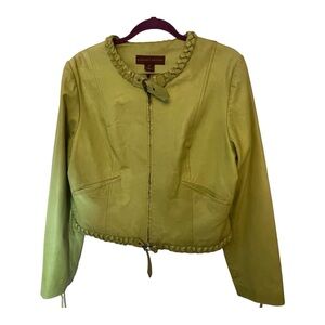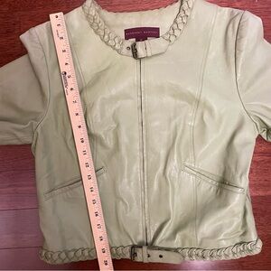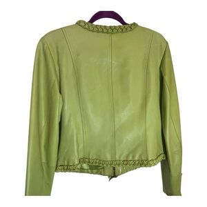 This green leather jacket combines a sleek, minimalist design with a cropped cut and cinched waist for a flattering fit. Its smooth texture and vibrant color make it a standout piece for any wardrobe. Perfect for adding a touch of elegance to your everyday style.