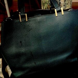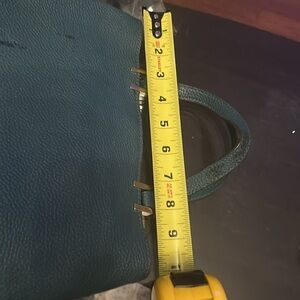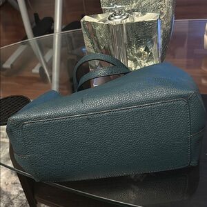 This elegant Kate Spade satchel in a rich green hue features a sophisticated textured leather finish. The bag's structured design and metallic hardware add a touch of luxury, making it perfect for both professional and casual settings. Its versatile size and classic silhouette ensure it complements any ensemble with ease.please note the long strap is missing & few scratches on the back part & one of the handle- Please see pics for details. Price reflects that tho!