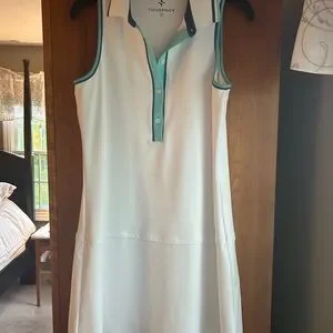 Chic white polo athletic dress. Features blue trim and button accents. Sleeveless design.