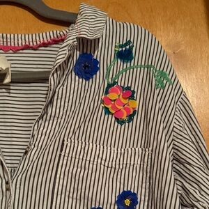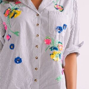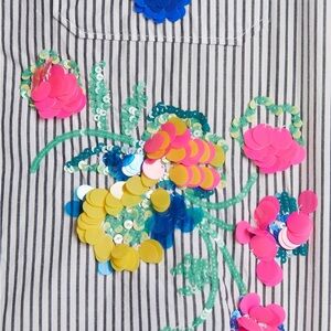 Stylish striped shirt with vibrant floral sequins. Features blue, pink, and yellow flowers. Perfect for a chic look.