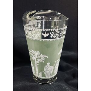 Vintage Wedgwood pitcher by Jeannette in "Hellenic" Greek green Jasperware. This original pitcher features a Greek-inspired design in green glass material, showcasing a timeless style. A collectible piece for those who appreciate vintage kitchen and home decor.