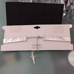ONLY **1** LEFT!!! NEW!!! NOIR JEWELRY Goth Vampire Ornate Silver Blood Red/Black Crystals Choker Necklace**Striking Metallic Silver Choker Necklace has a Large Ornate Silver Pendant that's accented with 2 Round Shaped Blood Red Crystals! Dangling below is an Oval Shaped Black Crystal & a Sword! Bring some Drama to your Neckline with this Mysterious Necklace!**Necklace is 16" Long with the Extender/Lobster Clasp**NEW ON HANG TAG!