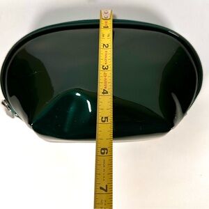 This is a La Mer cosmetic bag, likely used for storing makeup or other personal care items. It is a shiny, emerald green color with a zipper closure and a small pull tab. La Mer is a luxury skincare brand owned by Estée Lauder. The company is known for its high-end products and the use of marine ingredients in its formulas. La Mer offers a variety of makeup bags and cosmetic cases, often in similar colors and materials. These bags may be sold individually or as part of a set.