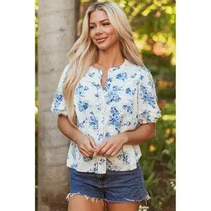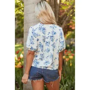 Sky Blue Floral Tiered Puff Short Sleeve Pleated Bust Buttoned Casual Shirt Size Small
