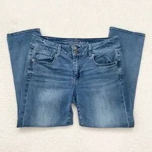 American Eagle Outfitters Artist Crop Jeans. Cute lighter wash!! These are 71% cotton, 15% viscose, 12% polyester, 2% elastane. Good stretch!! Approximate measurements are waist laying flat 15 1/2” across, Rise 9“, Inseam 25“ inches, not rolled up at the hems. Size tag 10 regular/standard. Please check my measurements for sizing. Jeans have factory fading. Note, My pictures may be coming up a bit off than the actual color. Good condition!!!💙