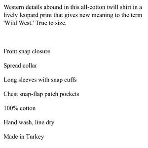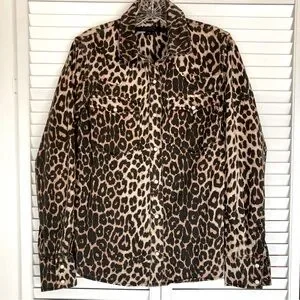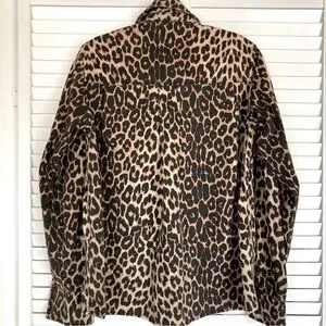 Stylish leopard print shirt. Button-down design. Perfect for casual wear. Jacket or top. Pearl buttons. Western wear. Chic.