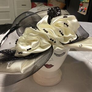 This is a great combination. We have the champagne color bag. It goes just beautiful. The head is also a gorgeous champagne color loaded with details so many sparkles so many bubbles. These hats were worn by a model. They are not brand new occasionally there might be a little something on them and I’ve tried to show that little bit of an area by the headband on the interior. It is 100% washable on the interior, which makes it warm, gorgeous beautiful great for Kentucky Derby great for any time of the year weddings your fall event events I can’t put into words how gorgeous it is loaded with crystals lots of bubbles, black champagne, beautiful band we see the mesh you just can’t find these anymore. The purse looks so good with that. I just decided to put it as a. Set. We are non-smokers no pet home.