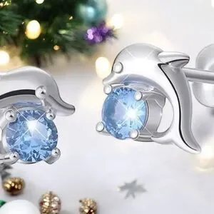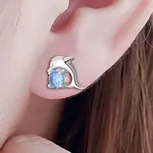 Sterling Silver Dolphin Earrings with Blue Gemstone .925