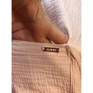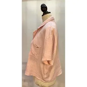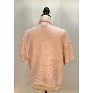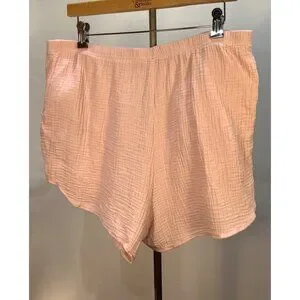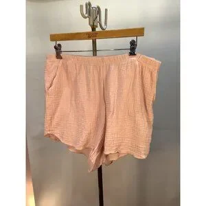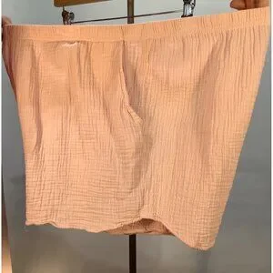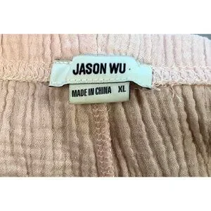This Peach colored Jason WU set combines comfort and style through soft gauze fabric. Featuring a button-down top and elastic shorts, it's versatile and lightweight.