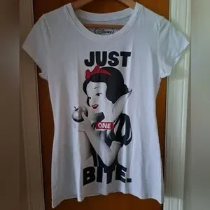 White t-shirt with Snow White and the words, "Just one bite."