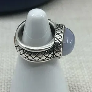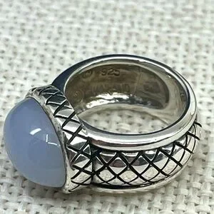 This vintage sterling silver ring is a striking piece from my well-kept estate collection, beautifully handcrafted in Thailand. It features a large, smooth blue chalcedony cabochon set in a bold, wide band etched with an intricate criss-cross lattice design that adds both texture and depth.