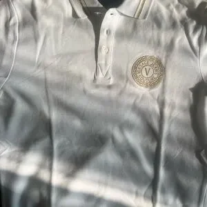 Experience the luxury of Versace with this elegant white polo shirt, featuring a classic design and a distinctive embroidered emblem on the chest with gold trim. Crafted from premium materials, this shirt offers a comfortable fit and a timeless style perfect for any occasion.