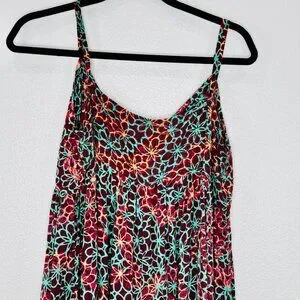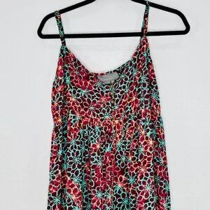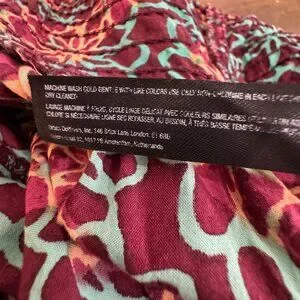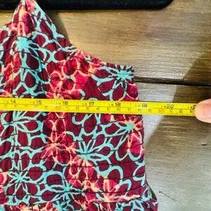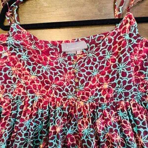 Preowned and in very good condition. Super cute floral print-turquoise, orange/peach prints on a maroon background. Smocking details across the bust area and at the cuffs, tiny cute brass buttons, and adjustable straps. Please see the photos for a good description of the condition and the measurements.