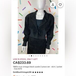 This fabulous two piece set is a true vintage piece from the 1980s. I know because I was there !selling for a friend… the skirt is fitted at the waist and flares out, and then has it even bigger flare at the bottom of the skirt, which gives it a western feel the waist is cut into a V at the front with an embroidered piece.. The jacket is a shorter bolero style, which is also fitted almost like a tuxedo fit with two buttons . Last pic is for price reference only.