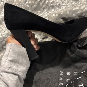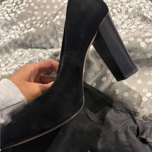 These elegant black heels from White House Black Market feature a sleek, minimalist design with a 3-4 inch block heel, perfect for professional and formal occasions. The closed-toe pumps are crafted from a soft material, offering both style and comfort.