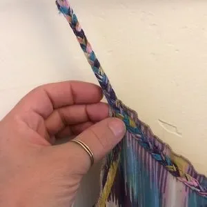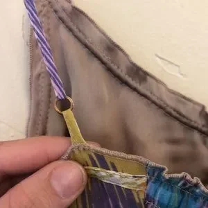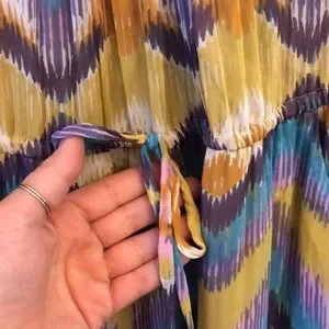 This dress is in good pre-owned condition. No signs of damage or flaws, only light signs of general wear. Fully Lined with Pockets. Mock waist tie detail. Braided straps. Dress huts right above knee. Colors are mustard yellow, Orange, purple, Bleu and white