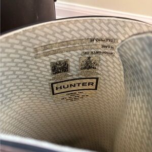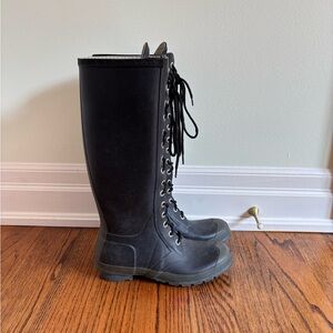 Experience the perfect blend of style and functionality with these Hunter black lace-up boots. Crafted with a robust rubber sole and a sleek leather-like finish, these boots are designed for durability and style.