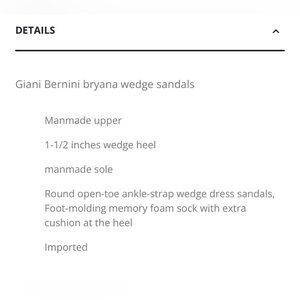 • features Elevate your style with these Giani Bernini gold wedges. The low wedge heel offers a comfortable lift, while the adjustable ankle strap ensures a secure fit. Perfect for both casual outings and dressier occasions, these sandals are a versatile addition to any wardrobe.