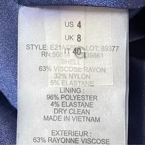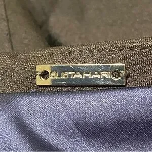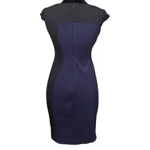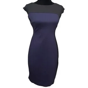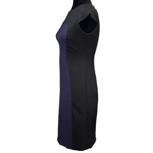In excellent pre-owned condition with no flaws. This Elie Tahari sheath dress features a striking navy and black colorblock design with modern mod-inspired lines that create a flattering, elongated silhouette. Crafted from a structured viscose-nylon blend with stretch for comfort. Perfect for cocktail parties, office-to-evening wear, or any elevated occasion.