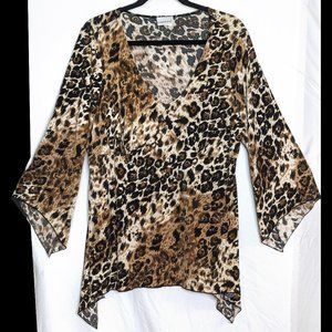 Flirty, Fantastic FASHION BUG Brown, Tan, Black & White Stretch Deep V-Neck Dressy Blouse, with Sharkbite Hem and with bell sleeve-ends. The print is in a bold, dynamic Leopard Pattern Print, perfect for making a statement! This superb *MADE IN USA* blouse is tagged a Misses Size 18/20W (1X), though may fit a small 22/24W 2X with Bust of 56" (maximum); top is in overall excellent condition.