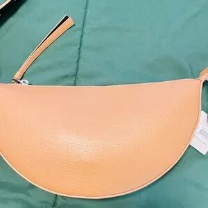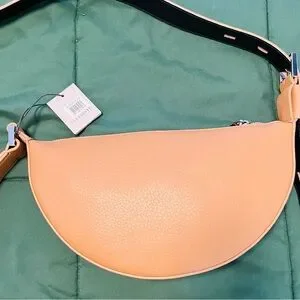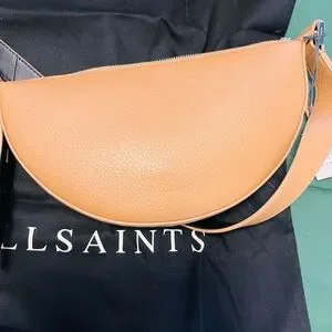 The All Saints Crescent Crossbody Bag features a sleek, minimalist design with a structured half-moon silhouette. Crafted from smooth leather in a vibrant yellow hue, it offers a stylish and functional accessory for any occasion. The adjustable shoulder strap ensures a comfortable fit, making it a versatile addition to your wardrobe.